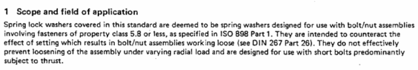 截图翻译:“本标准所涵盖的弹簧垫圈被视为专为与螺栓/螺母组件配合使用而设计的弹簧垫圈,适用于符合ISO 898第1部分规定的性能等级5.8或更低的紧固件。其作用在于抵消因紧固件松驰效应导致的螺栓/螺母组件松动现象(参见DIN 267第26部分)。此类垫圈无法有效防止组件在径向(横向)载荷作用下的松动,主要设计用于以轴向受力为主的短螺栓工况。”
